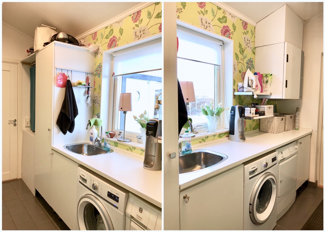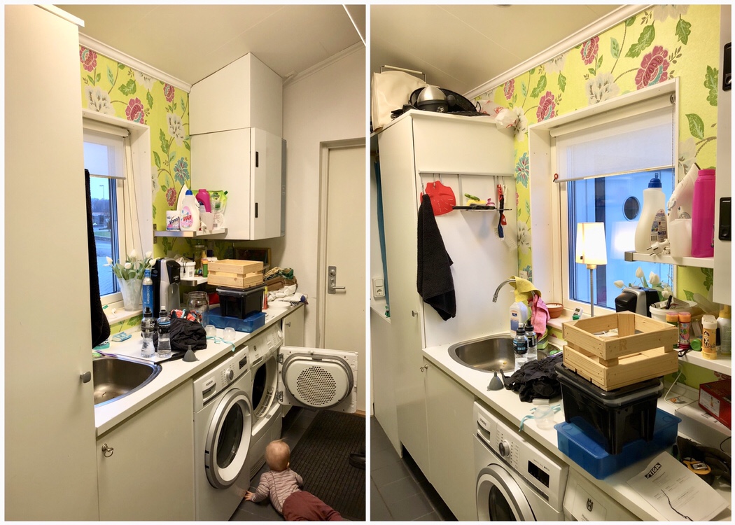 Nu har vi ju då monterat dit ett Elfa-system istället för de gamla överblivna hyllorna, så det är klart mer luftigt och ordnat – även om jag helst skulle vilja ha en drös fina förvaringslådor, men det får det bli allt eftersom. Det blir ju lite lättare att göra anpassningar efter just det behovet man har för stunden med ett sånt system, vilket kan behövas när familjen och dess medlemmar växer och får olika behov. Just nu behövde vi kunna förvara träningskläder och skor på ett smidigt sätt, utan att blockera tvättlinorna där vi hänger vår tvätt. Det måste ju vara tillräckligt lättillgängligt för att barnen faktiskt ska ANVÄNDA sina lådor, men jag tror det kan funka. Här kommer några före- och efterbilder från mobilen (det är dock extremt svårt att fota tvättstugan utan någon slags fisheye-lins eftersom den är så långsmal…).