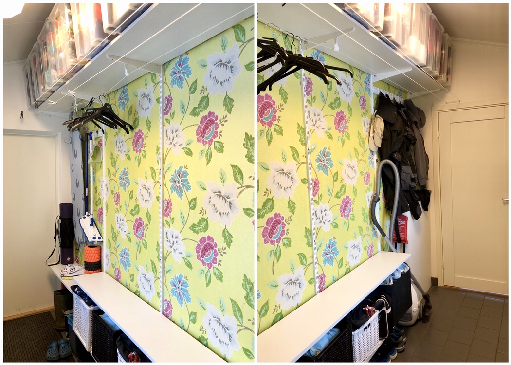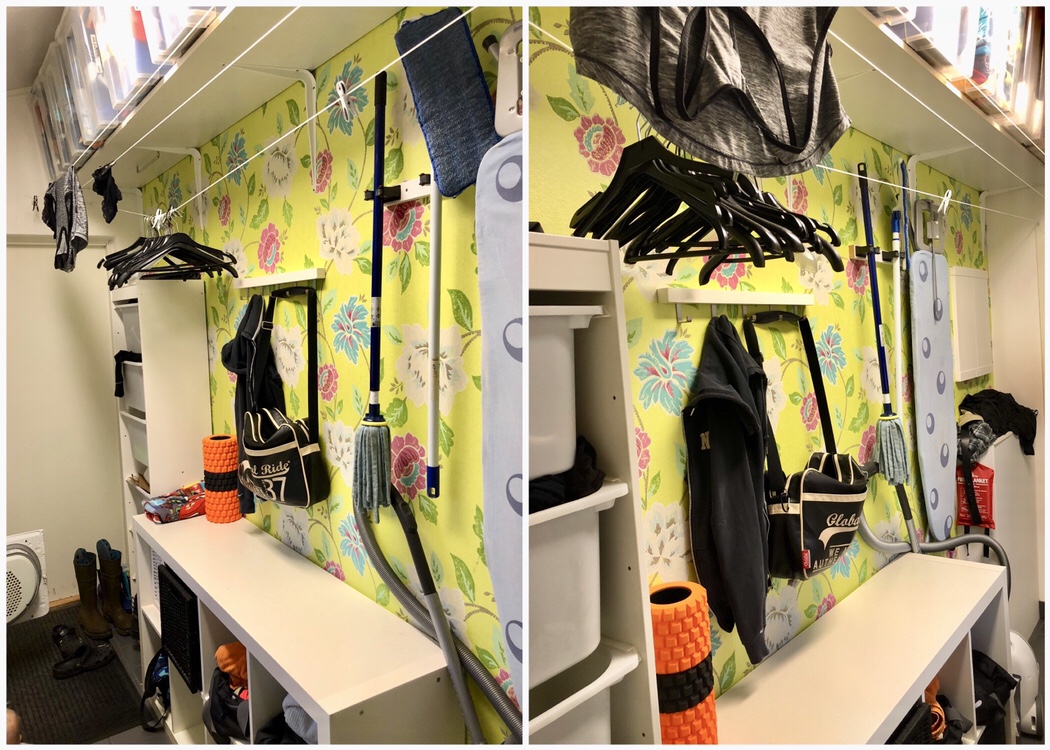 Här behöver vi få plats för förvarning av träningsprylar och skor, men samtidigt måste vi även fortsatt ha plats att hänga vår tvätt här. Sen har ju tvättstugan en förmåga att liksom samla på sig allt möjligt som inte har en bestämd plats….