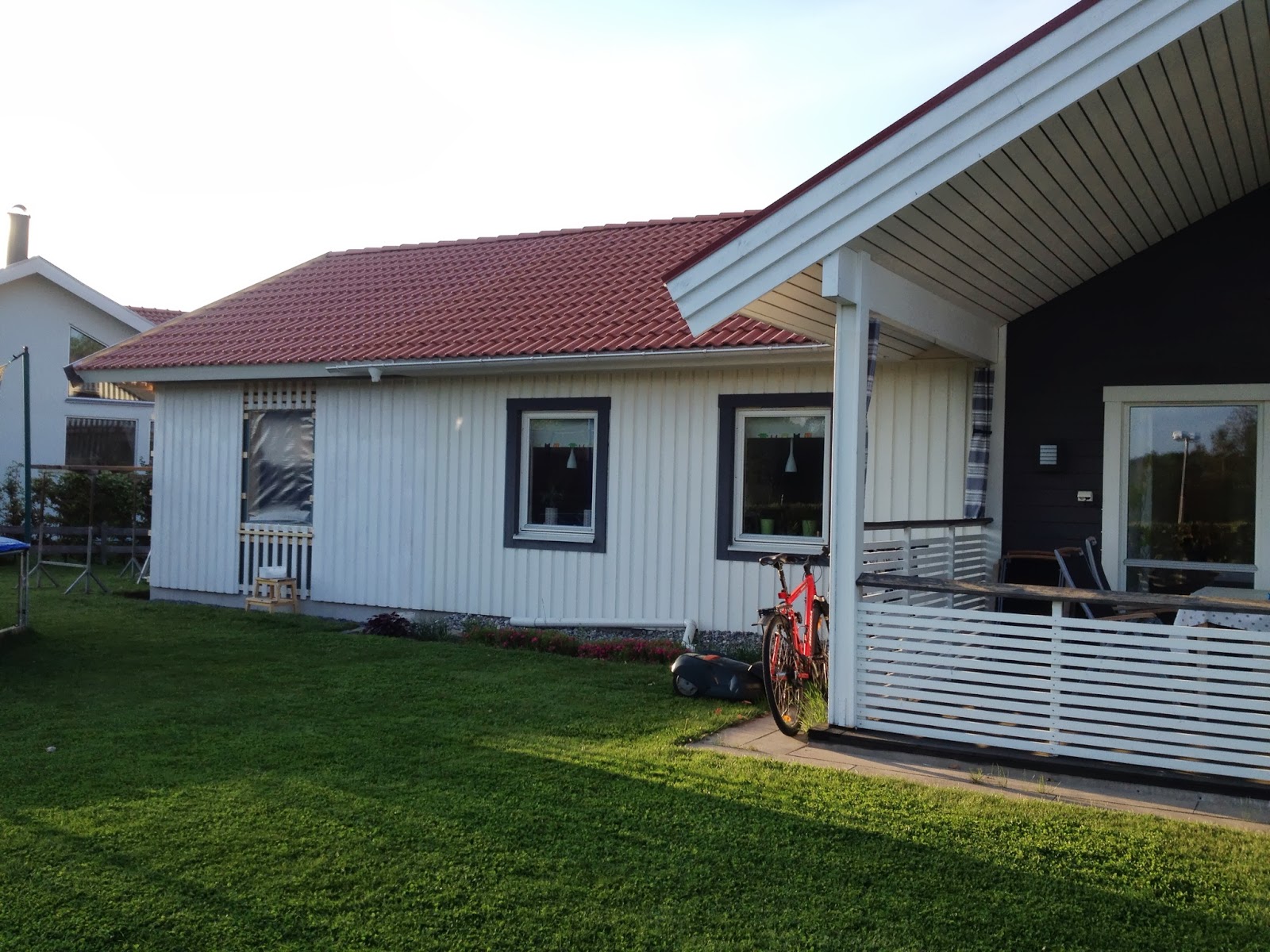 Hämta Oliver, hem och förbereda för att måla. Barnen studsar studsmatta, och hinner slå sig mot varandra 3 gånger innan jag ens hinner byta till målarkläder. Får spader och förbjuder dem att hoppa ihop, pratar på nytt med dem, inte lika pedagogiskt den här gången, och ber om lite hjälp så jag kan måla vindskivorna (dvs att de inte ska bråka med varandra). Mmm, jag hinner väl inte ens börja innan jag får dela på dem igen.