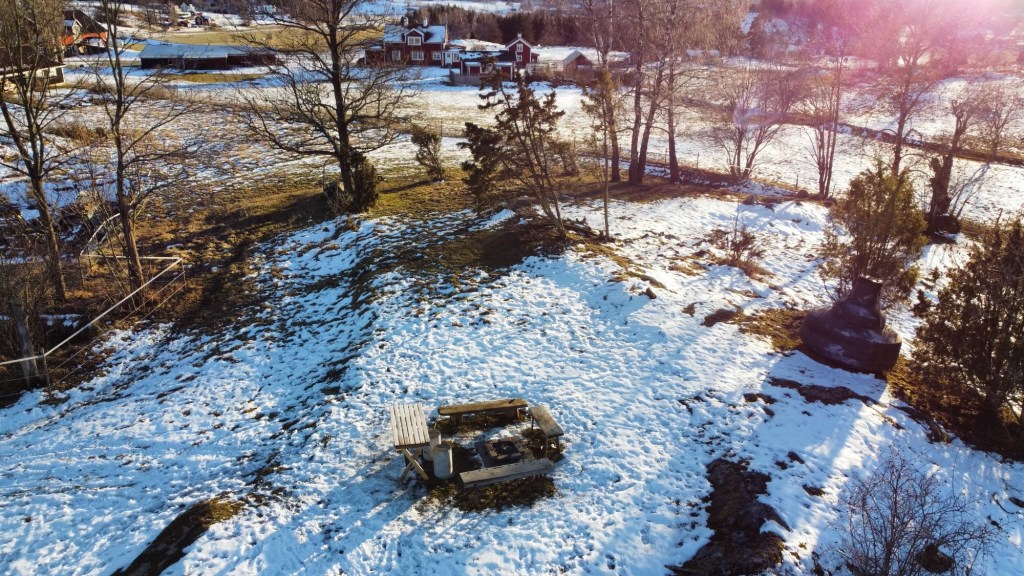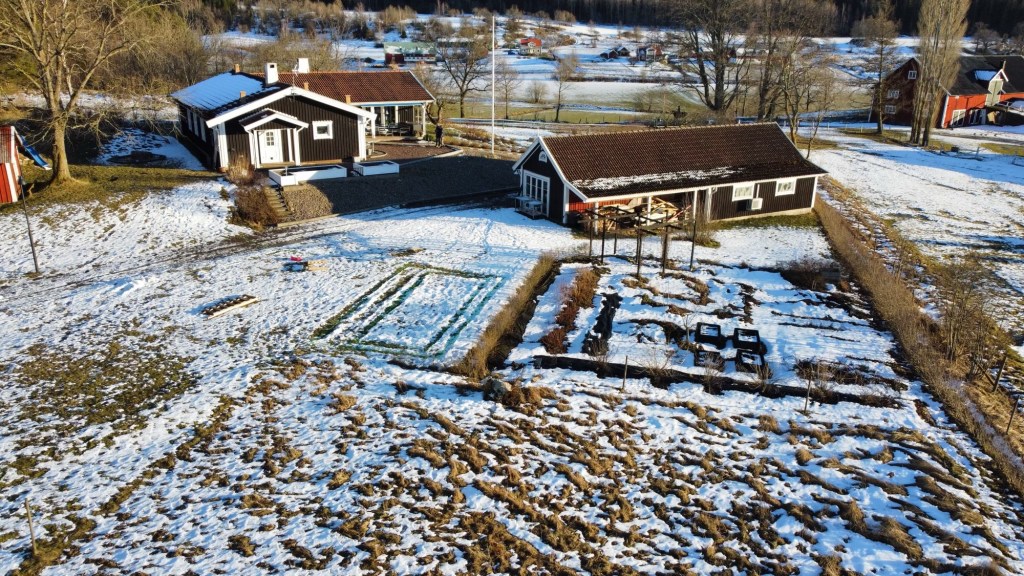 Längst till vänster skymtar hönshuset, sen vårt hus och till höger i bild är vårt garage (och vedförråd). Framför det ser ni trädgårdslandet.Här har ni trädgårdslandet från ovan, det ni ser till höger är jag som gått och drömt om ett tunnelväxthus någon gång och stegat upp i snön hur det skulle bli med den modellen jag tycker är lagom. För referens är det ett på 3×8 meter jag kollar på! Ni ser också 4 små rektanglar i köksträdgården, det är vanliga pallkragar – så där får ni en bild av hur stort det är ungefär. En bild från grillplatsen på vår kulle 😄Och så en bild rakt ovanifrån på hus och garage.
