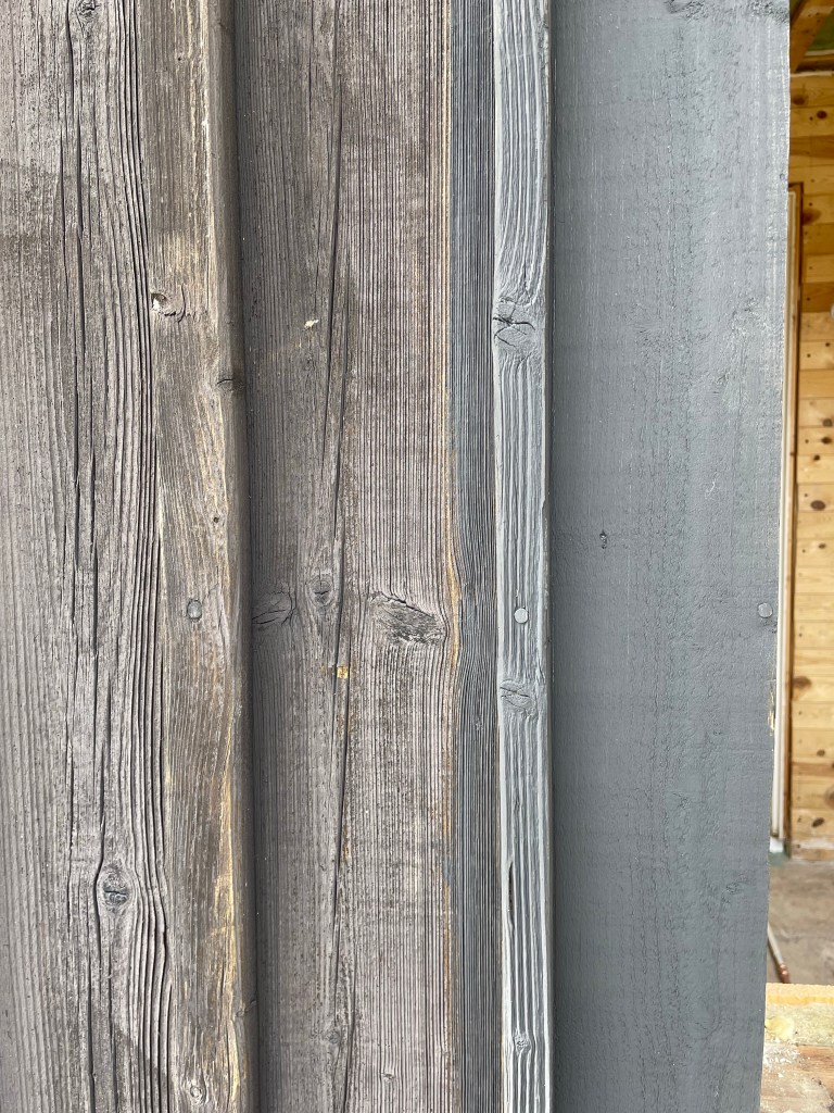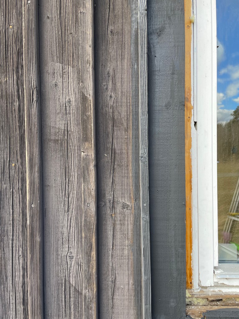Ville komma åt att måla precis runt fönstret med innan vi satte nya foder, men vi bestämde oss för att inte ta svart slamfärg igen utan en grå. Det blir liiite mjukare än den svarta tycker jag. Just nu blir det ingen enorm skillnad, men det är för hela huset behöver målas (sommarens projekt) och just nu ser lite dassigt ut. Nedan ser ni när jag målar med det grå precis runt fönstret, och det svarta, slitna bredvid.