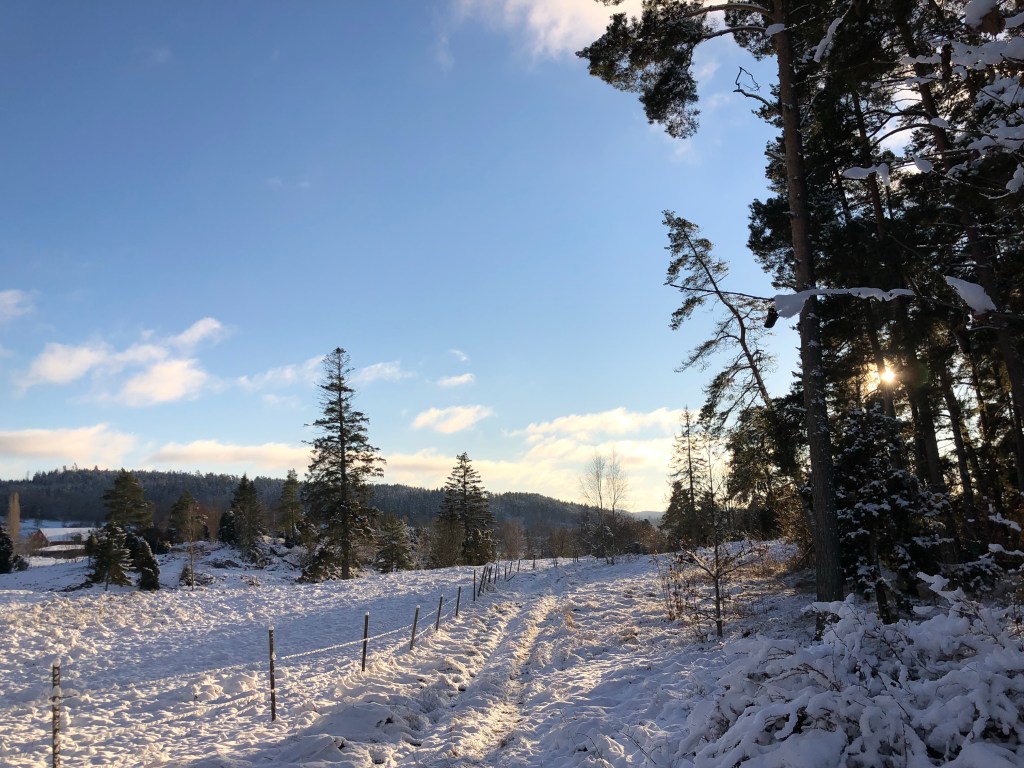 Jag älskar årstider – tydliga, ordentliga årstider. Alltså, en varm sommar, en höst med klar, hög luft och en vinter med ordentligt med snö. Alltså är jag betydligt gladare nu när det kommit snö här hemma! Sen är det ju alldeles speciellt att få uppleva allt det här för första gången här på gården nu. Passade på att ta med kameran ut i morse när jag rastade Nala, nu räcker tyvärr inte mina kamera-skills något vidare när det gäller att fota i gryningsljus med snö ser jag, men ni får ändå en känsla för hur det ser ut här.