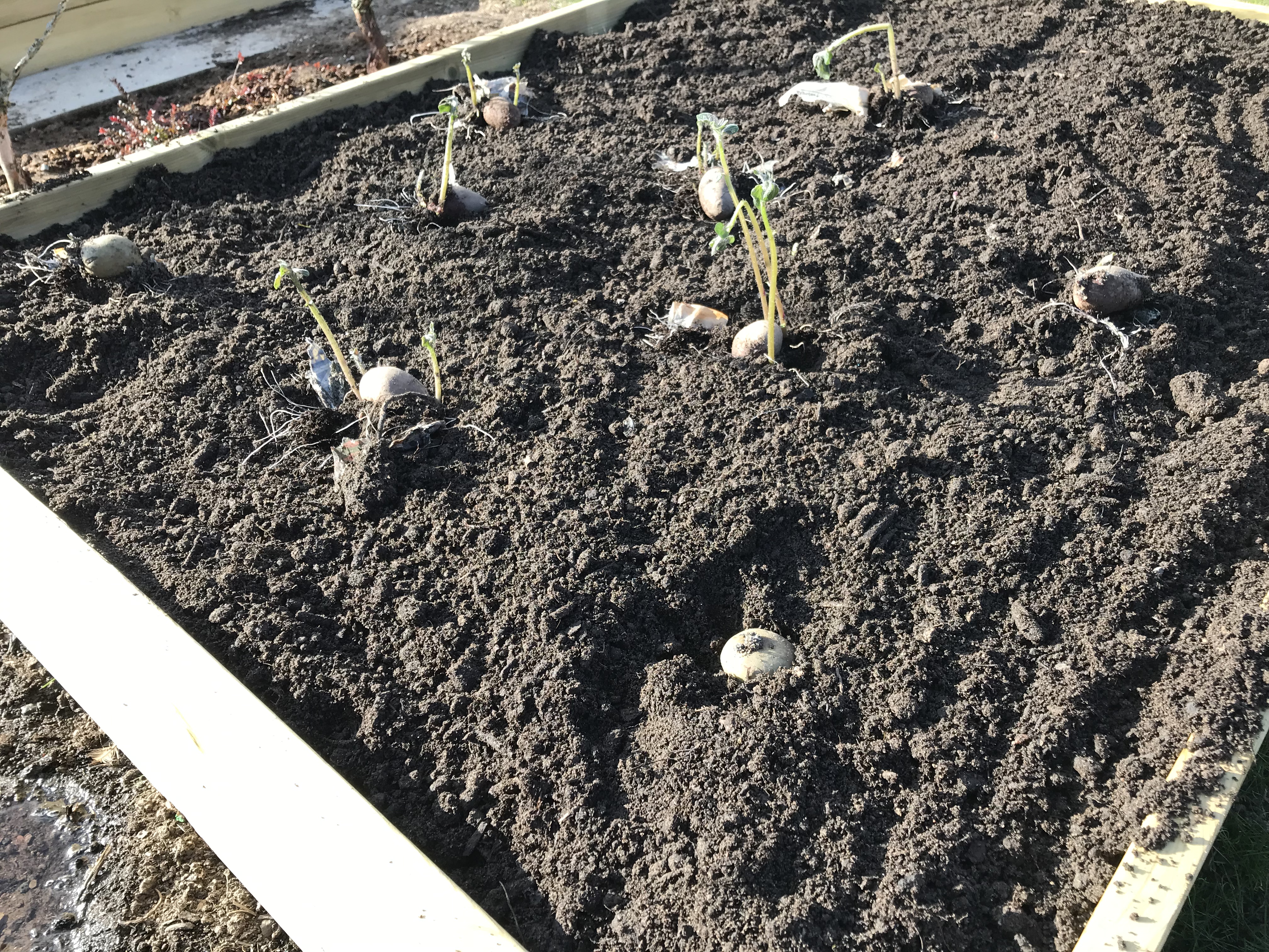 Bakom det som återstår av potatislandet skymtar blåbärsbuskarna som jag flyttade i våras, de har tagit sig bra och likadant päronträdet jag planterade förra hösten. I lådan som ser ut som en komposthög (vilket det just nu är) hade jag mina pakchoi’er – till nästa år ska jag så en minivariant och lite färre av den. Blev dock himla bra när man för-sådde!