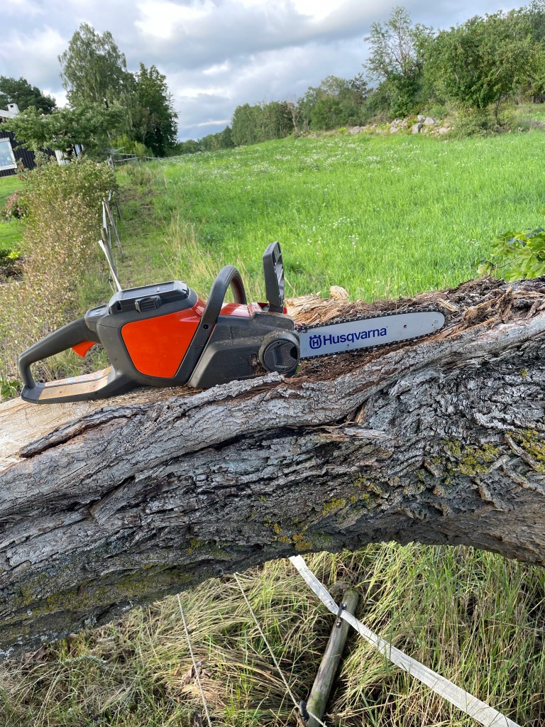 Eftermiddagarna efter jobbet har spenderats med att ta hand om den jättelika grenen som blåste ner från vår ena ENORMA lönn vid infarten till vår gård. Jag gissar på att de är närmare 30-40 meter höga vardera, och säkerligen över 100 år, så det är inget jag kan plantera nytt och få samma effekt av inom min livstid liksom… Blev så ledsen när den visade upp en ganska rutten insida och fick hjälp av grannen som har varit arborist att göra en bedömning – vi kommer behöva ta ner hela trädet… Iofs otrolig tur att vi just HAR en granne som kan och som är otroligt snäll och hjälper till med detta – och som även hjälper att dela de större bitarna av grenen, där vår el-motorsåg inte riktigt räcker till. Konstaterar ju att grenen, som är som ett stort träd i sig, ger ENORMA mängder blad- och grenverk att ta hand om – en del kommer bara eldas upp (smådelarna) i ett (eller fem) bål, resten ska få bli ved för kommande vintrar. Vi hoppas kunna vänta till resten av lönnen tappat sina blad innan vi tar ner hela, blir liiite enklare att ta hand om då.