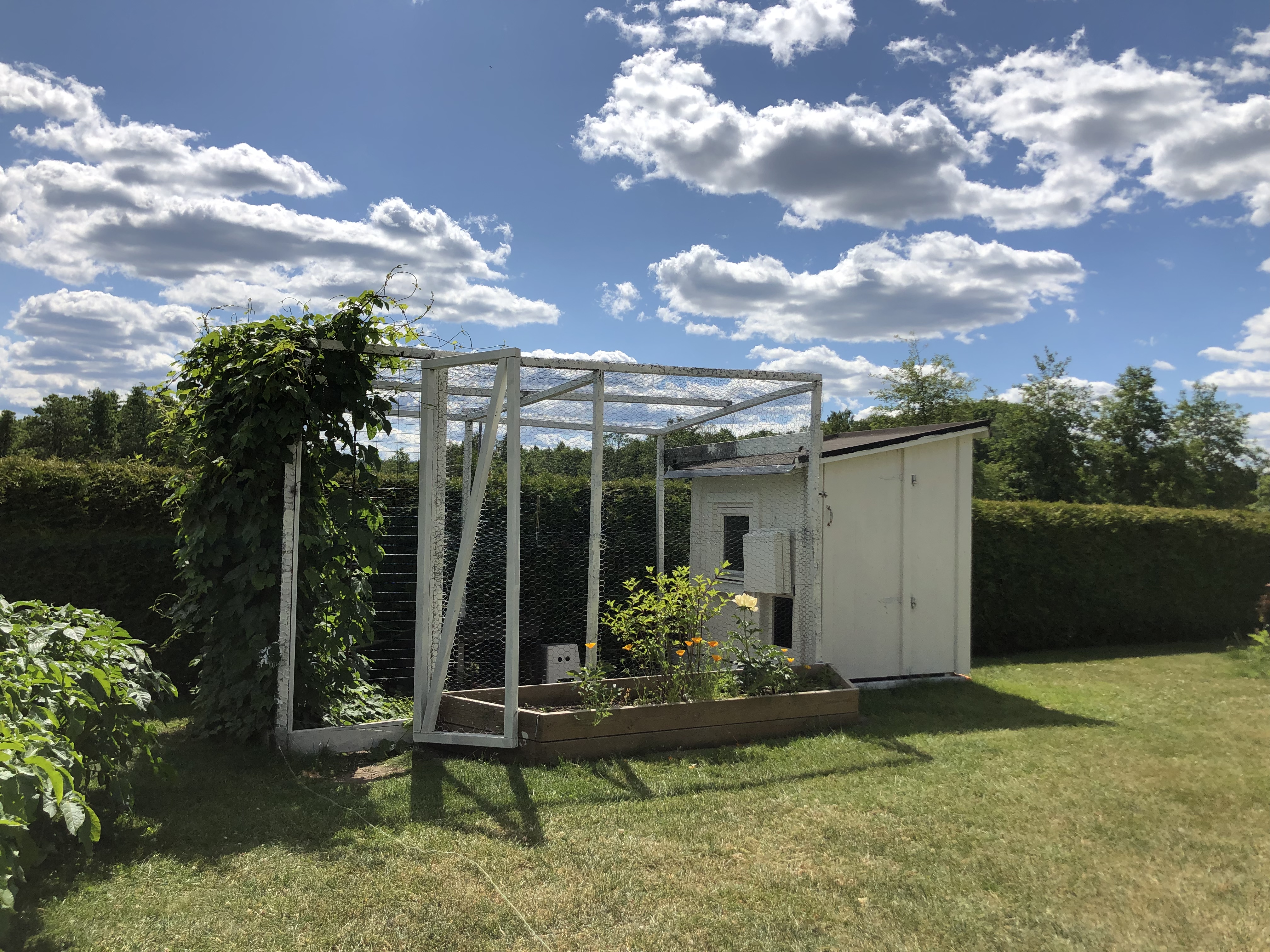 Intill vårt päronträd vi satte i höstas har jag planterat ut mina förodlade Pak Choi. I landet bakom är det mer potatis, en påse blandade sommar-blommor och så smultron. Vi får ju näta in bär så inte hönorna äter upp alla…